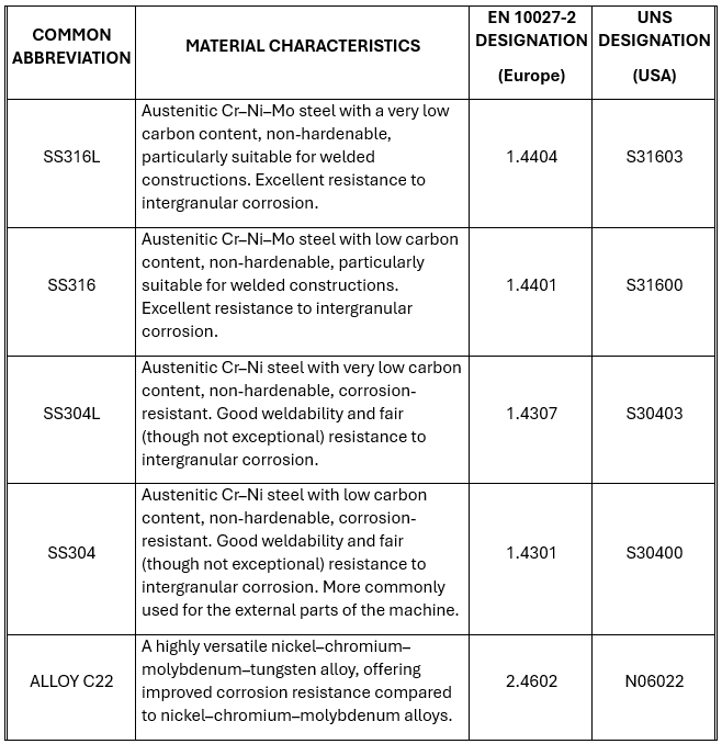 As shown in Table 1, the most suitable construction materials for resisting the most aggressive corrosion processes are nickel-chromium-molybdenum-tungsten alloys (Alloy C22). Steels such as AISI 304 and AISI 304L, in the pharmaceutical sector, are instead used for components or plant sections not directly in contact with the treated product.