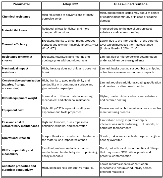 Alloy C22, therefore, represents an advanced construction solution. In such equipment, carbon steel is used only for secondary elements that do not come into direct contact with the process, or is completely replaced by stainless steels (AISI 304 or AISI 316), depending on design choices and client specifications. This clearly distinguishes Alloy C22 from glass-lined equipment, where the use of carbon steel as a structural substrate is essential to provide mechanical strength and stability during thermal cycles, making the system more vulnerable to potential damage of the protective coating.