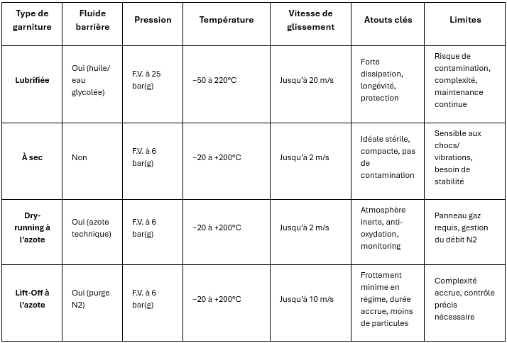 Le système secondaire, à joints toriques en perfluoroélastomère certifié FDA, assure la compatibilité fluide-procédé et l’étanchéité sous pression variable (max. 25 bar(g)). Elle requiert toutefois un monitoring continu du fluide barrière et une maintenance planifiée.